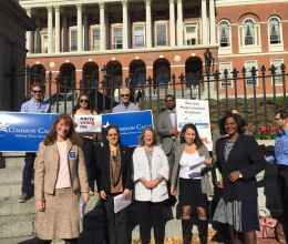 Photo: Rahsaan Hall (back row, far right), director of the ACLU of Massachusetts Racial Justice Program, rallies for early voting efforts alongside other members of the Election Modernization Coalition.